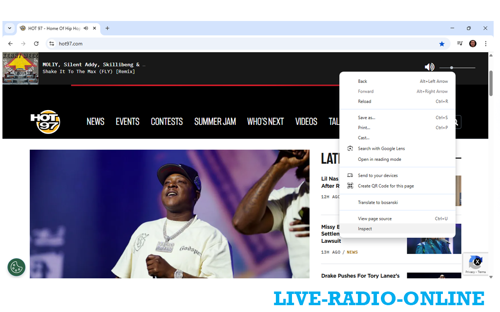 If for some reason you need to find the streaming address of your favorite radio station, we'll show you how to do it. For example, we'll use HOT 97 from New York. Simply visit their website, hot97.com, and click the play button to start streaming their radio program. Then, you click anywhere on the page with the right mouse button. Various commands will appear, click on "Inspect".